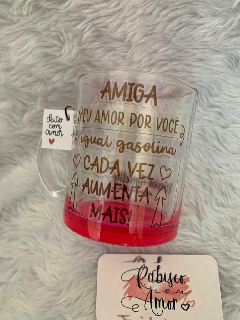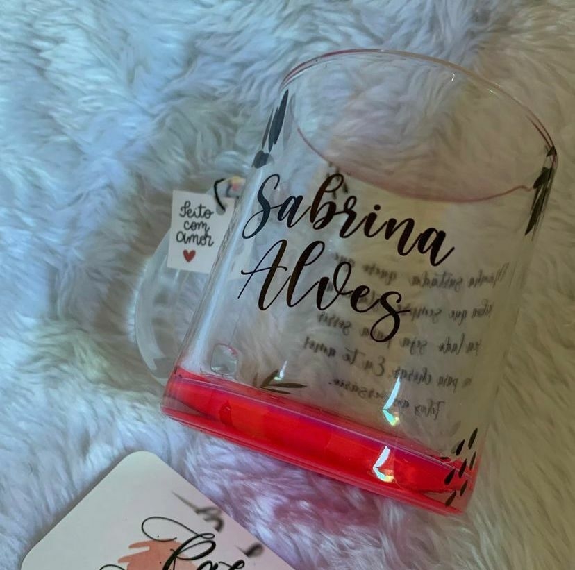 Caneca de Vidro Com fundo Rosa com tema de amizade (330ml) e/ou personalização exclusiva escolhido pelo(a) cliente.